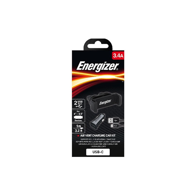 CHARGEUR VOITURE 17W + SUPPORT CLIP ENERGIZER + 2 USB-C CABLE - Puissance: 17W - Intensité: 3.4A - Support Pour smartphones 4 à 5.7" - Inclinaison 360° - Chargeur voiture 3.4A - 2x Port USB