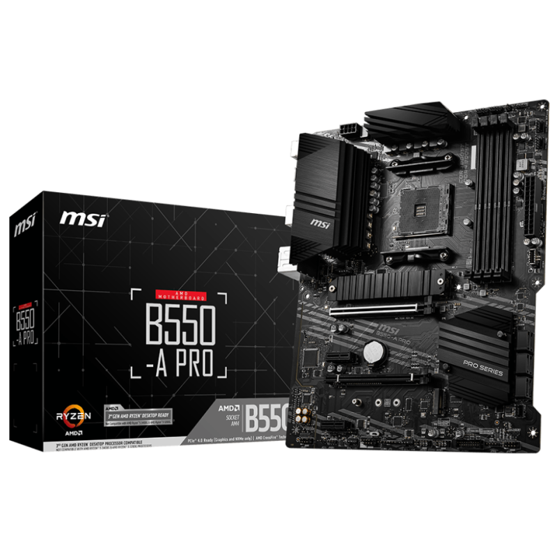 Carte mère MSI B550-A PRO - Facture de forme: ATX - JEU DE PUCES: AMD B550 - Support des processeurs AMD Ryzen de 3ème génération et des futurs processeurs AMD Ryzen avec mise à jour BIOS - Socket AM4 - MÉMOIRE: 4x DDR4 - Capacité mémoire maximale 128 Go - 2x PCI-E x16 - PCI-E Gen: Gen4 / Gen3 - 1x PCI-E x1 - 6x SATA III - 2x Emplacement M.2 - RAID: 01/00/10 - 1x USB-C 3.2 (avant) - 2x USB 3.2 (avant) - 1x USB-C 3.2 (arrière) - 3x USB 3.2 (arrière) - 4x USB 2.0 (avant) - 4x USB 2.0 (arrière) - 1x Ports série (avant) - Ports audio (arrière) - 1x DisplayPort - 1x HDMI - DirectX 12 - Feux croisés Y - - Dimensions: 215 x 243.84 mm - Garantie 1 an