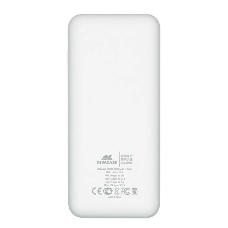 Power Bank RivaCase 20000 mAh -Capacité : 20 000 mAh (37 Wh) -Sortie Totale : 10W – 2.1A -Ports USB-A : 5V–1A / 5V–2.1A -Ports USB-C : 5V–2.1A -Entrées : Micro USB & USB-C (5V–2A) -Recharge 2 appareils simultanément -Dimensions : 68 x 17 x 150 mm -Poids : 380g