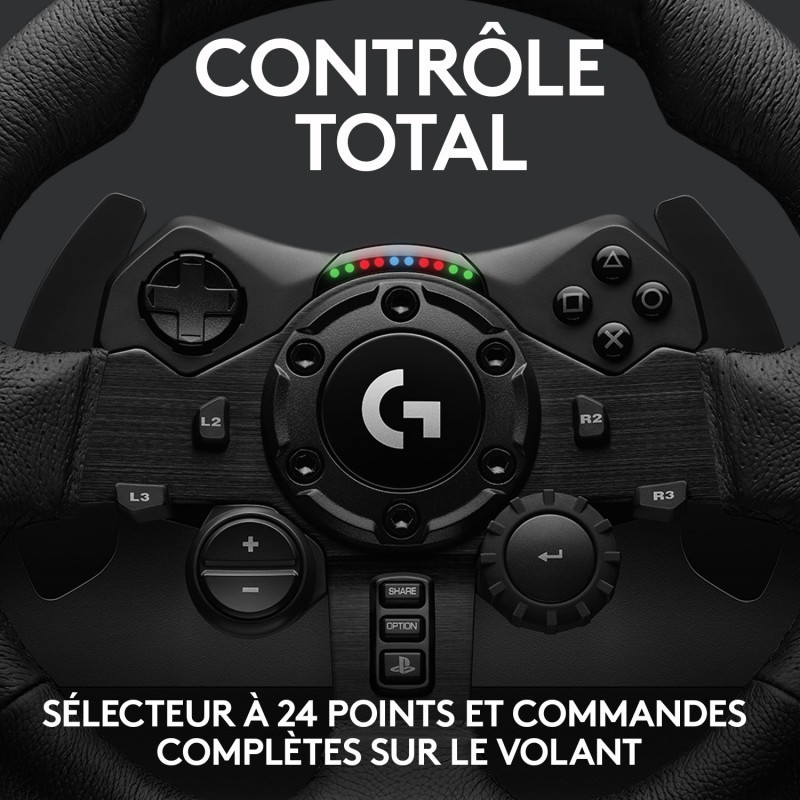 Volant de course avec pédales Logitech G G923 - Volant à rotation 900 degrés - Retour de force à deux moteurs avec technologie TrueForce - Protection contre les surchauffes - Commandes de jeu sur le volant - Pédale de frein non linéaire pour un meilleur contrôle - Système antidérapant breveté - Repose talon antidérapant texturé - Dimensions du volant (HxLxP) : 270 x 260 x 278 mm pour 2.25 kg - Dimensions du pédalier (HxLxP) : 167 x 428.5 x 311 mm pour 3.1 kg - Compatible PC et PlayStation 5 / PlayStation 4 - Garantie: 1 an