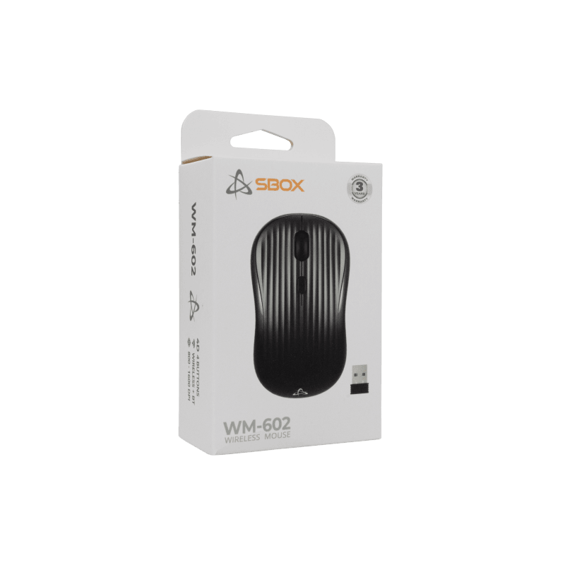 Souris Sans Fil SBOX WM-602 - Technologie de Connectivité : Sans Fil : BT / 2,4 GHz - Type de souris: 4D - Type de capteur : Optique - Résolution: 800 - 1600 DPI - Taux de sondage : 125 Hz - Matériau: Plastique ABS - Durée de vie: 2 M presse - Batterie : 500 mAh (Lithium) - Distance de fonctionnement: 10 mètres - Longueur du câble (m) : 0,3 (pour le chargement) - Compatibilité de la souris: Windows XP/7/8/10/11 / MacOS - Dimensions: 98 x 60 x 38 mm - Poids: 66 g