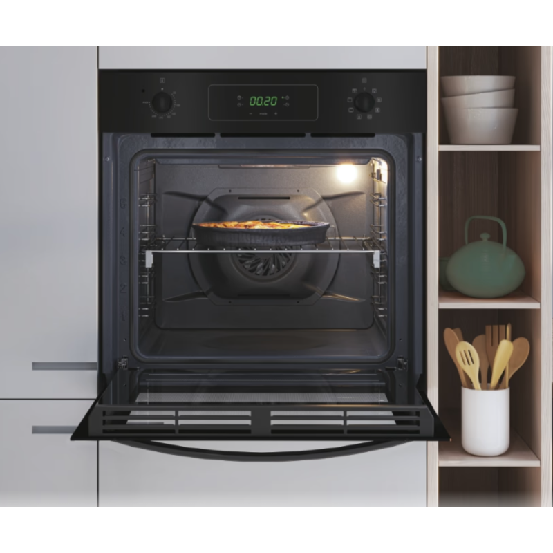 Type de Gaz: Electrique - Volume: 70 Litres - Classe Énergétique: A - Chaleur tournante - 6 Fonctions - Système de nettoyage hydrolytique - Grilles latérales - Porte de four en acier inoxydable et verre - Boutons et poignée en Inox - 1x Plateau - W x D x H (mm) 595 x 595 x 568 - Couleur: Noir - Garantie: 1 an