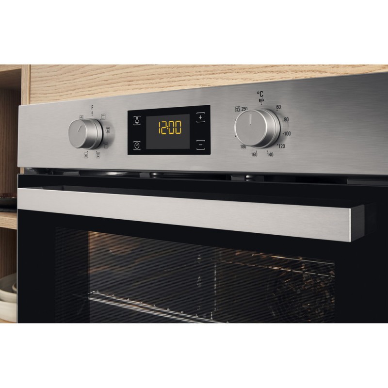 Type de four : Electrique - Largeur: 60 cm- Volume cavité: 71 Litres-Puissance Grill : 1800W -Nombre de programmes : 10 (8 tarditionnels+2 automatiques) – Interface : 2 boutons + affichage numérique - Classe énergétique : A –Fonction Fours: : Multifonction 8 (MF8) -Système intégré de Nettoyage : Hydrolytique -cavité plate-Dimensions ( H x L x P): 59,5 x 59,5 x 55,1 cm - |Caractéristiques :Mutiflow Technology-Forced Air-Telescopic Guides -Electronic Temperature control -Diamond Clean Type de pose : encastrable - Couleur : Inox- Garantie : 3 ans
