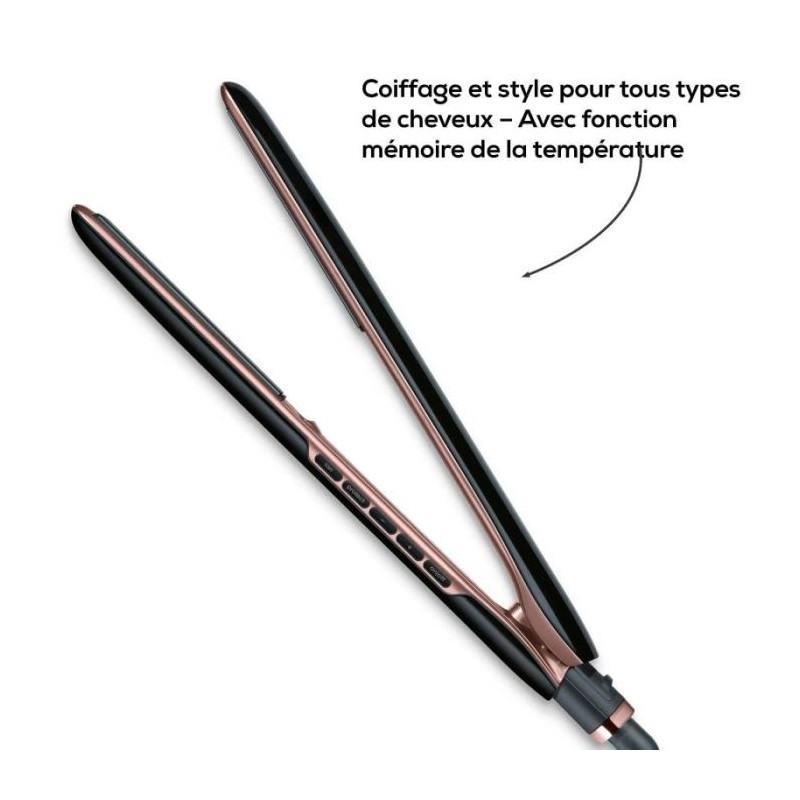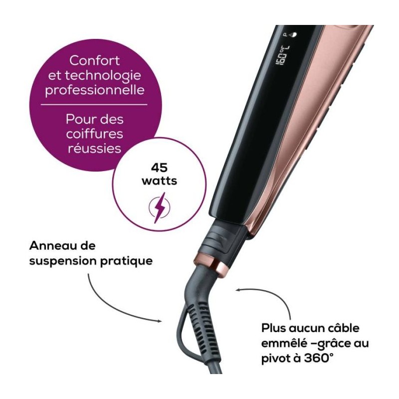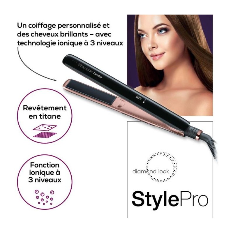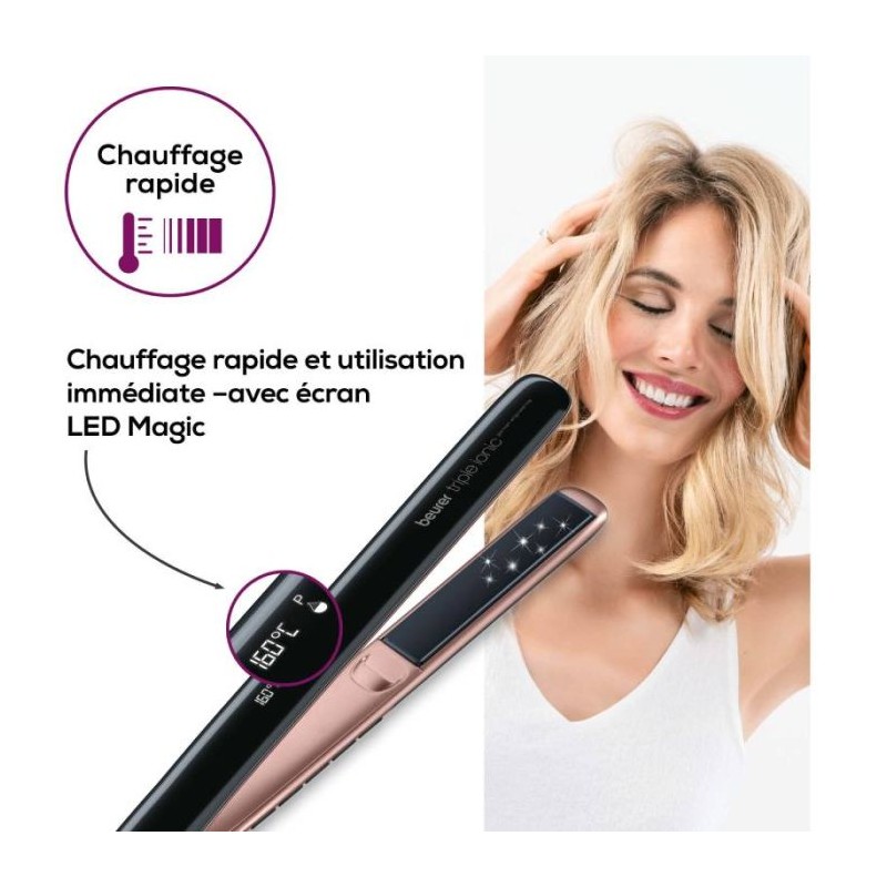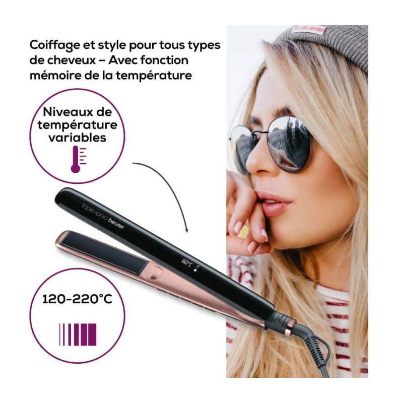Lisseur Cheveux BEURER - Puissance: 45 watts - Niveaux de température variables: 120 - 220 °C - Réglage de la température - S'adapter à tous les types de cheveux - Sécurité anti-surchauffe automatique - Chauffe rapidement pour une utilisation immédiate - Écran LED - Écran Magic-LED qui n'apparaît que pendant l'utilisation - Triple fonction ionique: technologie ionique à 3 niveaux pour des coiffures uniques et des cheveux brillants - Revêtement en titane pour protéger les cheveux - Fonction de protection pour préserver les cheveux et l'éclat des couleurs - Anneau de suspension pour un rangement pratique - Verrouillage des plaques pour un rangement et un transport faciles - Touche de verrouillage - Pivot 360° pour une utilisation pratique sans câble torsadé - Pochette de rangement résistante à la chaleur - Couleur: Noir et Rose Gold - Garantie: 3 ans