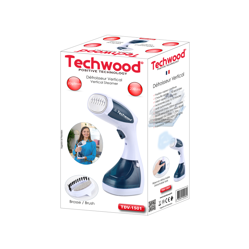 Position vapeur continue - Chauffe rapide : - 30 secondes - Débit vapeur 12-20g/min - Autonomie jusqu'à 10 minutes - Arrêt automatique - Réservoir d'eau 200ml amovible - Brosse amovible pour tissus épais - Longueur du câble : 1.70m - Alimentation 220-240V ~ 50-60Hz - Puissance 1500W