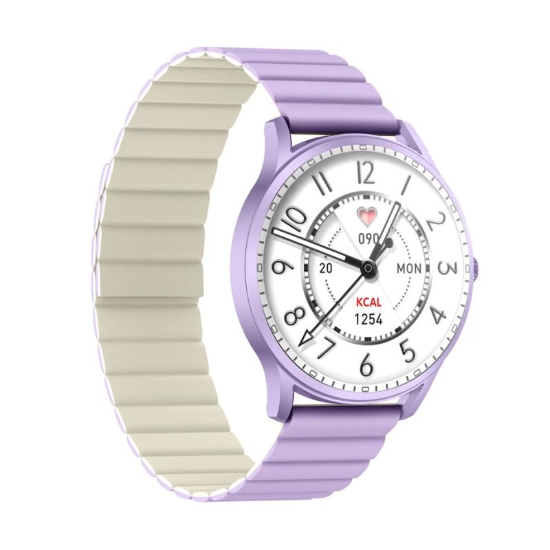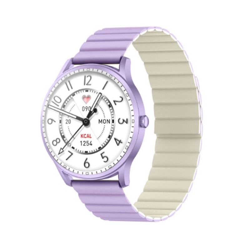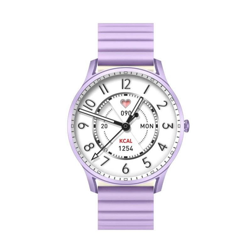 Connectivité: Bluetooth 5.2 - écran semi-AMOLED 1.32" 3D sphérique (360 x 360px) - Microphone et Haut-parleur - Appel Bluetooth - Fréquence cardiaque, moniteur d'oxygène sanguin - Lecteur de musique - Capacité de batterie: 280mah - Temps de Charge: 2 heures - Autonomie: 3-5 jours, jusqu'à 10 jours en veille - 70 Modes sport - Étanche: IP68 - Boîtier en aluminium - Compatibilité : Android et iOS - Couleur: Violet - Garantie: 2ans