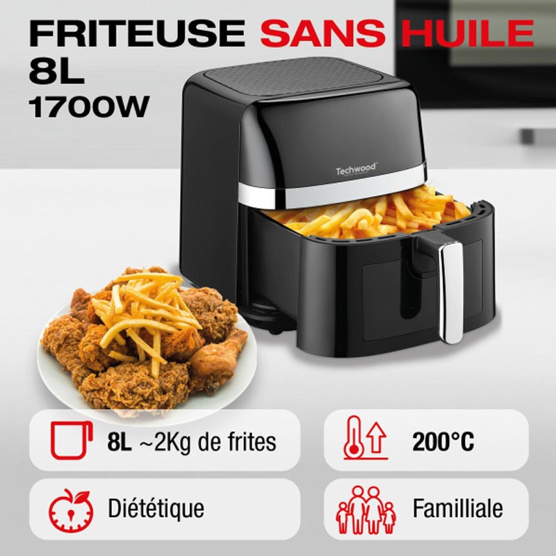 AirFryer TECHWOOD - Puissance : 1700W - Capacité : 8 Litres (2Kg de frites) - Nombre de programmes : 8 programmes - Thermostat réglable : jusqu'à 200°C - Minuterie : 60 minutes - Protection anti surchauffe - Cuisine saine et faible en matière grasses - Panneau de commande : Digitale tactile - Signal sonore de fin cuisson - Témoin lumineux de mise en marche - Arrêt automatique - revêtement anti adhérent - tiroir amovible - Couleur : Noir - Garantie 1an