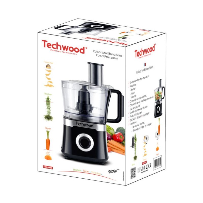 Robot Multifonction TECHWOOD - Puissance: 600-800W - Capacité: 1.5L - 2 Vitesses + Fonction Impulsion - Alimentation: 220-240V~ 50/60Hz - Fonctions: Hacher, Râper, Trancher - Couvercle avec une large cheminée plus son poussoir - Double système de sécurité - Pied anti-dérapant - Livré avec: 1 lame pour Hacher, 1 disque pour Râper ou Couper - Couleur: Noir -