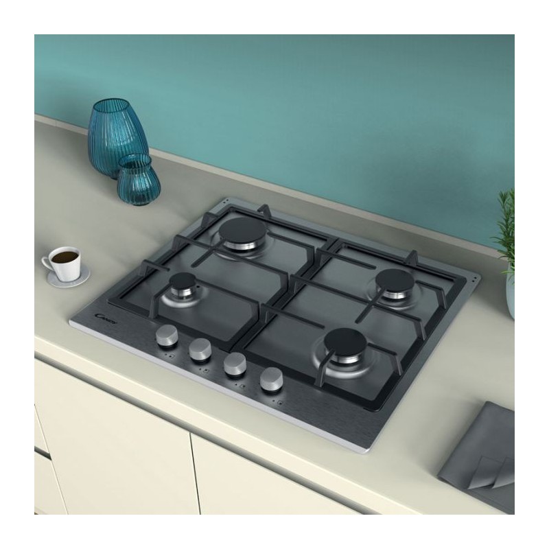 Type de Table: Gaz - Largeur: 60 cm - Nombre de Foyers: 4 Foyers - Grilles en fonte - Thermocouple - Allumage integré - Système de sécurité - Matière: Acier inoxydable - Dimensions: 590 x 510 x 35 mm - Couleur: Inox - Garantie: 2 ans