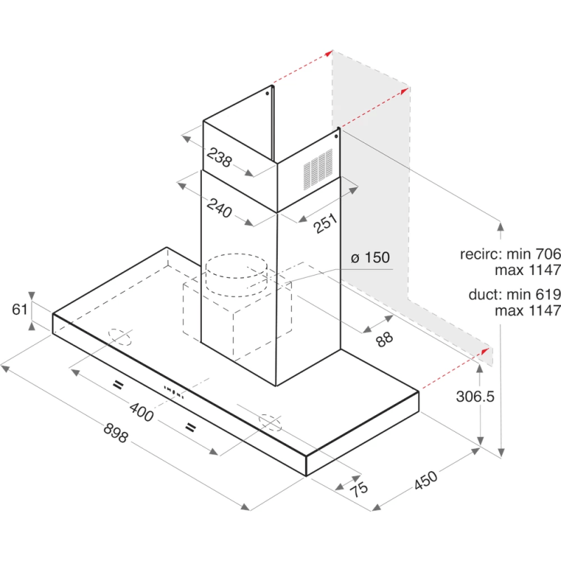 Type : Hotte T-Box (décorative murale) -Largeur: 90cm -Vitesse : 3 -Débit d'air : 432 m3/h -Niveau sonore :67 dB - Type de commande : boutons programmables - Type de dispositif de contrôle : boutons -Type de Filtre: alluminium lavable- Eclairage : LED -Lumières :2 - Dimensions (HxLxP) : 115,0 x 90,0 x 45,0 cm -Couleur : Inox- Garantie :3 ans.
