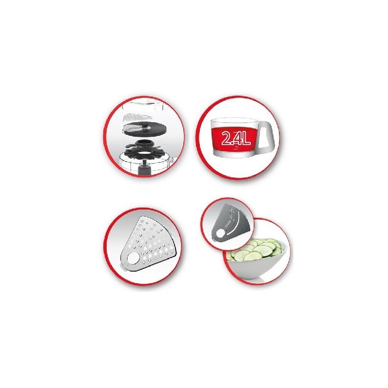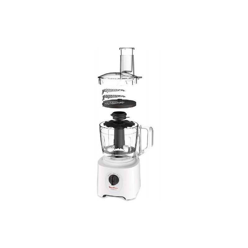 Puissance: 700 W - 3 Vitesses - Bol en Plastique - Capacité du bol: 2.4 L - Capacité du blender: 1.8 L - Couvercle anti-projection - Rangement des accessoires intégré: Dans le bol - Dimensions: 41 x 26 cm - Poids: 3.2 Kg - Accessoires fournis: Couteau pétrin, disque pour émincer, disque pour râpe, découpe légumes, disque pour émulsionner