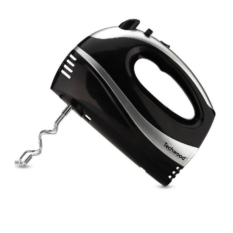 Batteur à main TECHWOOD - Puissance: 200 Watts - Nombre de vitesse: 5 Vitesses réglables + Position Turbo - Bouton éjection des fouets - Très silencieux - Livré avec fouets et crochets Chromés - Alimentation : 230V ~ / 50Hz - Couleur: Noir - Garantie: 1an