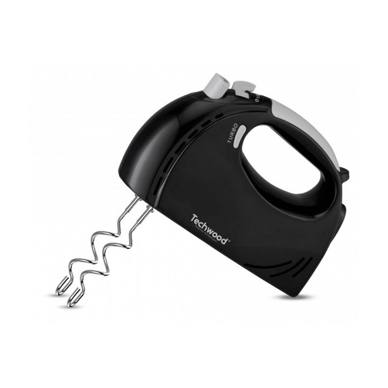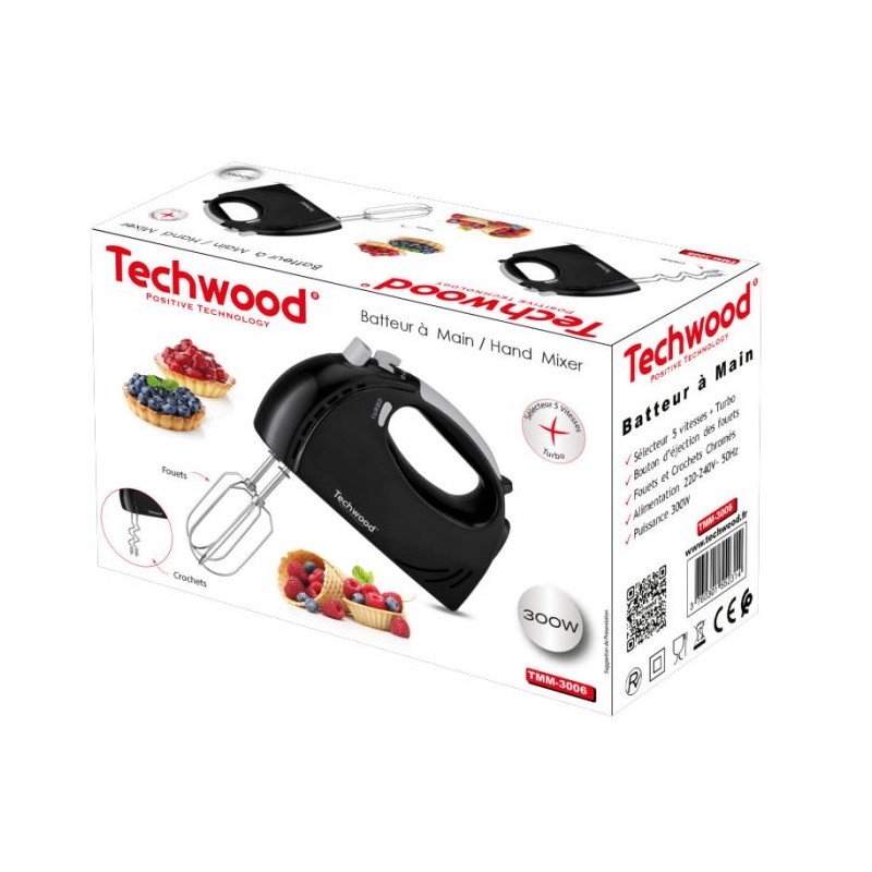 Batteur TECHWOOD - Puissance: 300W - 5 vitesses Turbo - Bouton d’éjection des fouets - Fouets et Crochets Chromés - Alimentation 220-240V~ 50Hz - Couleur: Noir - Garantie: 1an