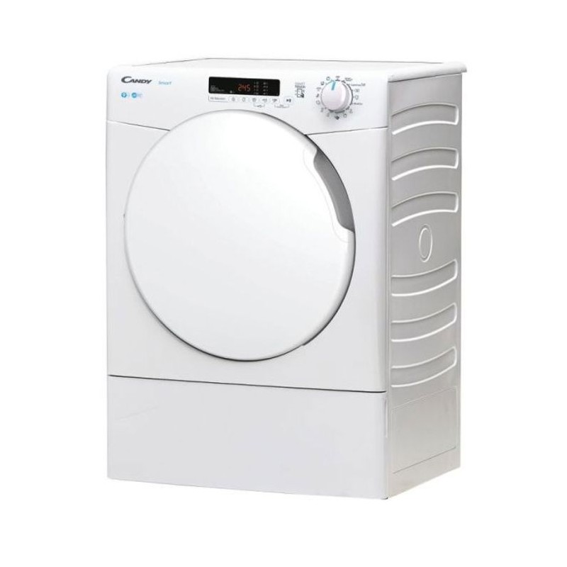Sèche linge Frontale CANDY - Type de séchage: Evacuation - Capacité du sèche-linge: 9 kg - Volume du tambour: 125L - Classe d’efficacité énergétique: A+ - Consommation d'énergie annuelle: 640 KW/An - Programmes de séchage: 15 Programmes - Indicateur de fin de cycle - Option de fin différée - Pieds réglables - Capteur d’humidité - Alimentation: 220-240V - Dimensions: H x L x P: 85 x 58.5 x 58.5 cm - Poids: 34.1 kg - Couleur: Blanc - Garantie: 2ans