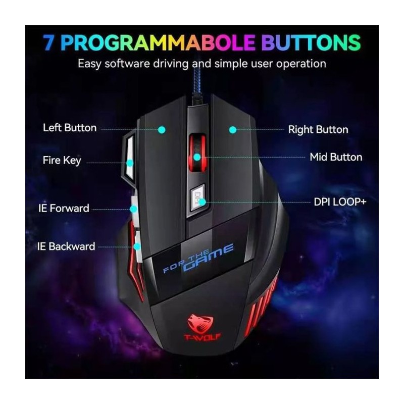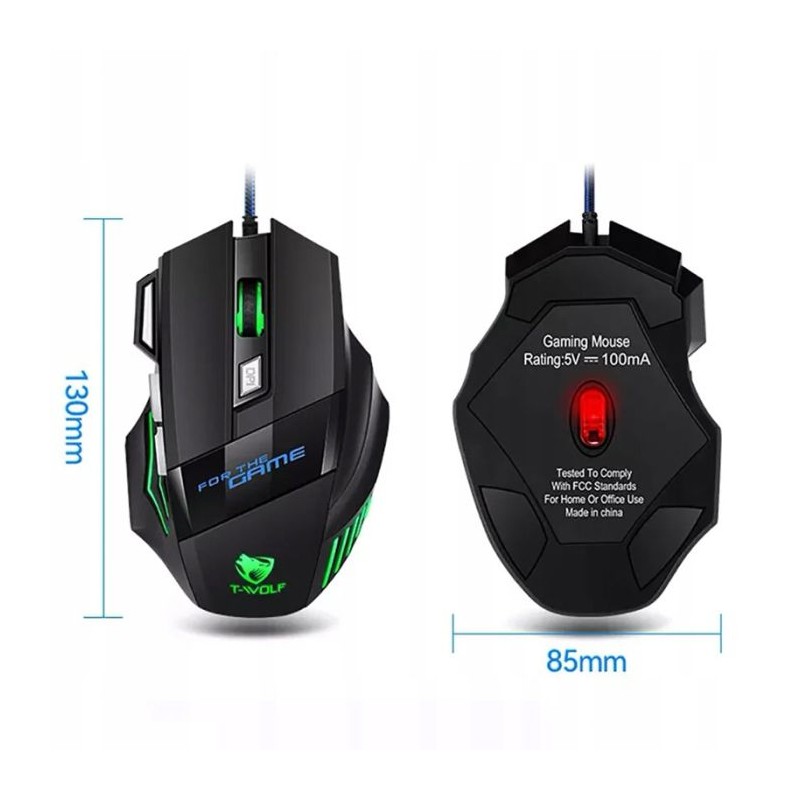 Souris Gamer T-WOLF M1 - Technologie de connectivité: Filaire - Interface: USB 2.0 - Résolution: 3200 DPI - Nombre de boutons: 7 programmables - Éclairage RGB (Lumières respirantes à 7 couleurs) - Léger et confortable - Longueur du câble: 1.4 mètre - Dimensions: 130 x 85 x 40 mm - Poids: 127 g - Couleur: Noir - Garantie: 1 an.